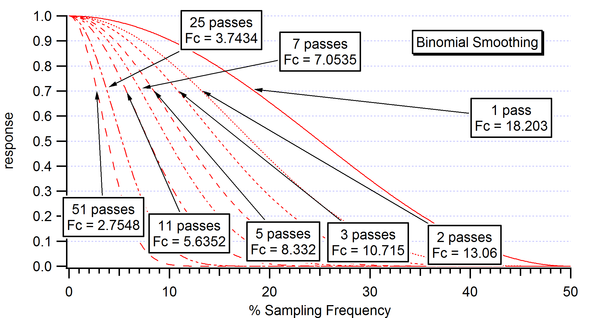 JimProuty Choose a number that give the desired response (trial and error), or look at the filtering response curves in: File->Example Experiments->Analysis->Smoother Operation Responses (Note: that experiment uses the term "Gaussian" to refer to binomial smoothing.) --Jim Prouty Software Engineer, WaveMetrics, Inc. Attachments BinomialAkaGaussianSmoothing.png (77.53 KB) Log in or register to post comments June 28, 2013 at 03:22 pm - Permalink