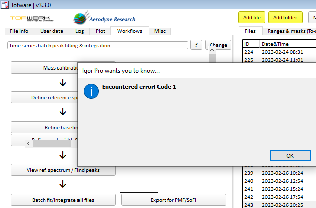 Posting this for a friend who doesn't yet have a forum account but runs Igor Pro. While processing some HDF5 Tofware data on Igor 9, he and I are seeing a "Code 1" error (shown below). I am not sure what this error means and whether the cause is rooted in Igor Pro or in Tofware. Hence thought to share here... If possible, kindly advise how to resolve this error.. my first hunch is a compatibility issue but don't know for sure.