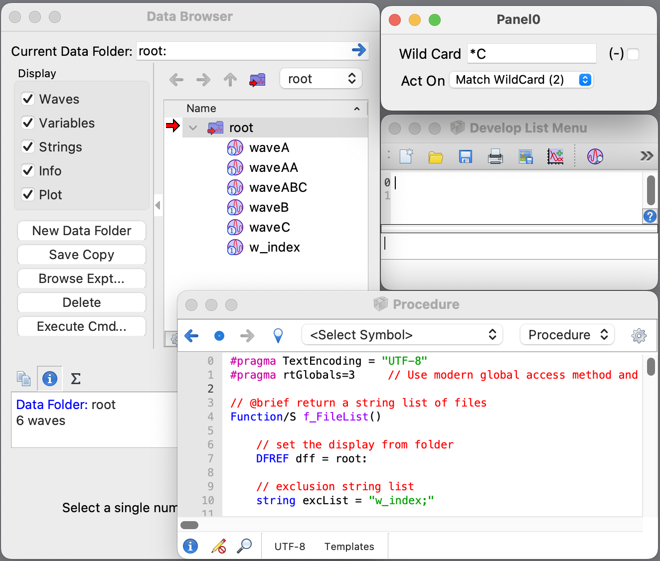 The attached experiment gives a crude example of code that returns a string list of waves based on a wild card or its negation. The string is used to (re)populate a popup menu on a panel. The string could just as well be sent to a listbox or to a processing function that accepts a string list.