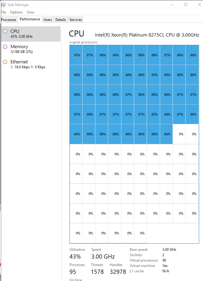 I starting this test again on a different Windows 2019 server with TWO of these processors totalling 96 available threads (AWS c5.24xlarge):