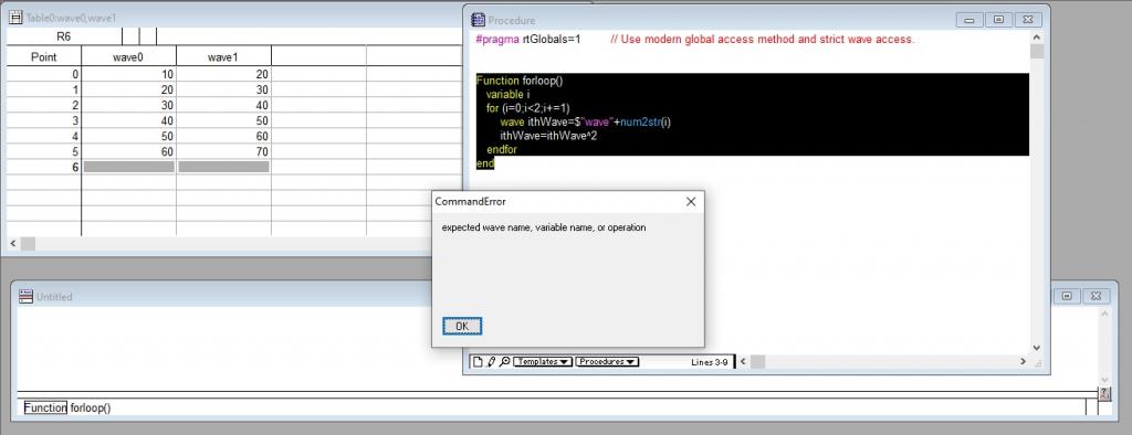 Since this is my first ever programming in Igor Pro, I began with a small step first. I created a sample wave0, and tried to square the points in that wave 2 times using loop.