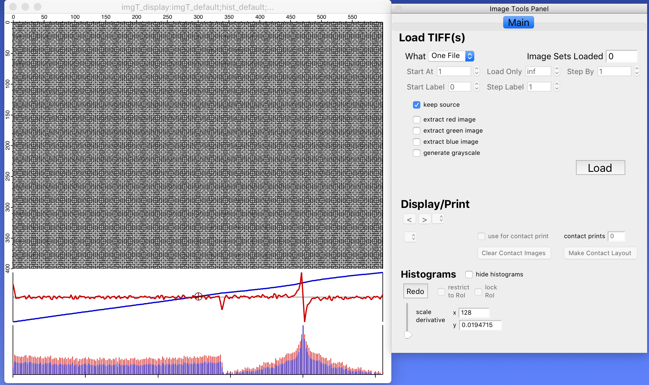 * simultaneously see the histogram (both linear and log scales) as well as the cumulative and derivative of the histogram while the image is being displayed (or hide the histogram views when desired)