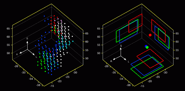 Representation of movement related activation in the primary motor cortex of humans obtained with functional MRI. The left panel illustrates the distribution of activation for the group of participants. Each dot represents the location of a voxel with statistically significant movement related activation. The geographical center and the standard deviations (rectangles on the surface walls and floor) of the activation for each finger is illustrated in the right. A = anterior; L = lateral; S = superior. Graphics created with Igor 3.16 using the SurfacePlotter module.